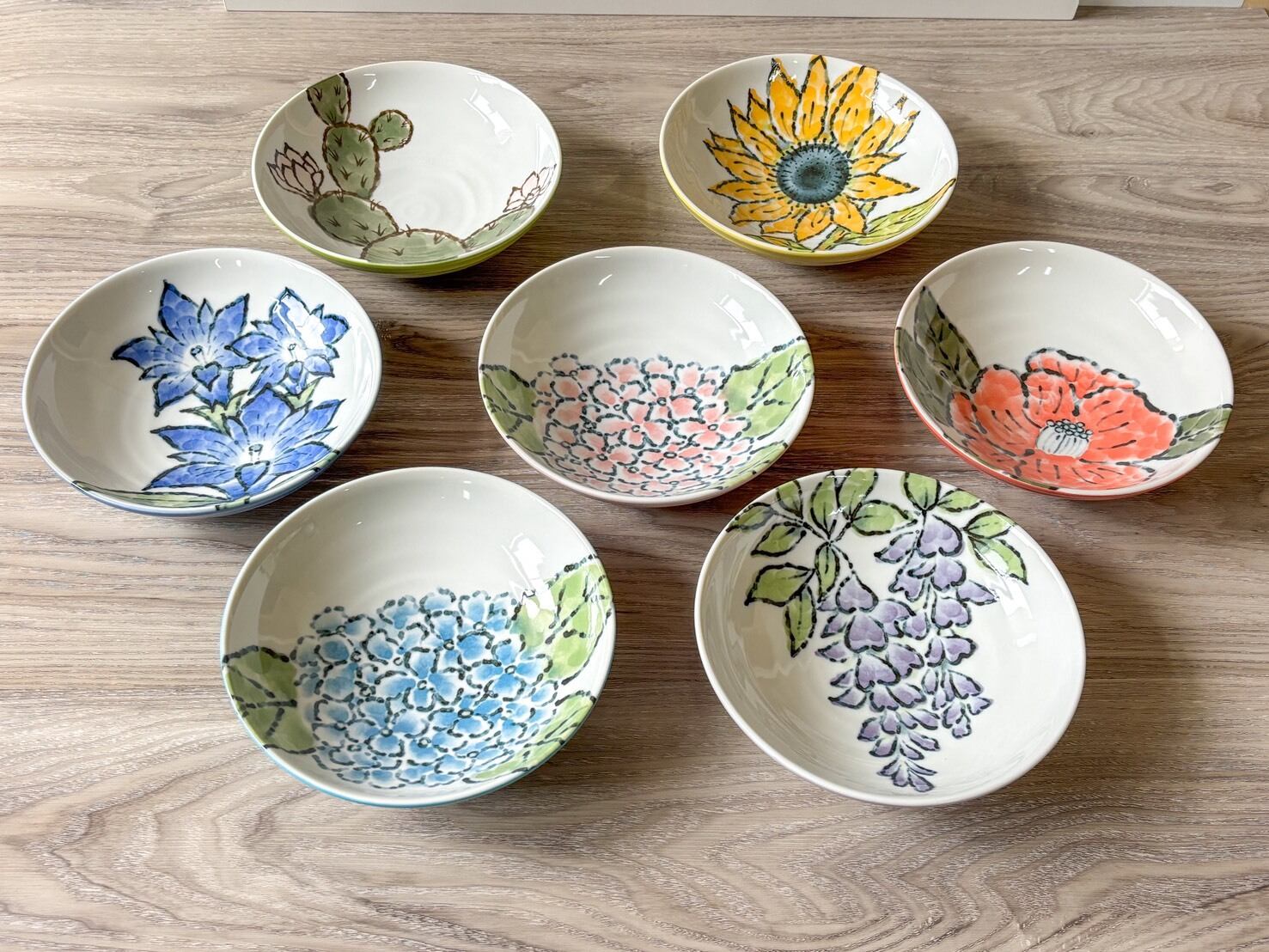 椿(つばき)、竜胆(りんどう)、藤(ふじ)、紫陽花(あじさい)、向日葵(ひまわり)、覇王樹(さぼてん)